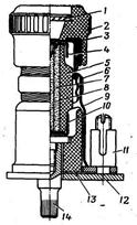 9 – контактная гильза, 11 – контактная шайба; 12 – гетинаксовая шайба; 13 – основание;