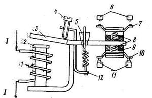 1 – катушка; 2 – сердечник катушки; 3 – якорь; 4 – регулировочный винт; 5 – регулировочная гайка; 6, 7, 10 и 11 – контакты; 8 – амортизирующие пружины контактов; 9 – изолирующие колодки; 12 – отключающая пружина