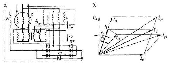 а – принципиальная электрическая схема; б – векторная диаграмма токов СВАРН