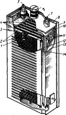 Рис. 5.9. Устройство щелочного аккумулятора: 1 – активная масса; 2 – палочки распорные эбонитовые; 3 – ламель-футляр; 4 – положительные пластины; 5 – вывод; 6 – пробка; 7 – вывод; 8 – крышка стальная; 9 – корпус аккумулятора; 10 – баретки (соединительные мостики); 11 – отрицательные пластины; 12 – контакт-