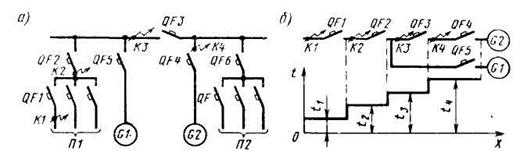 Рис. 6.5. Избирательная защита участков электрической сети: «— принципиальная схема; б — временная диаграмма