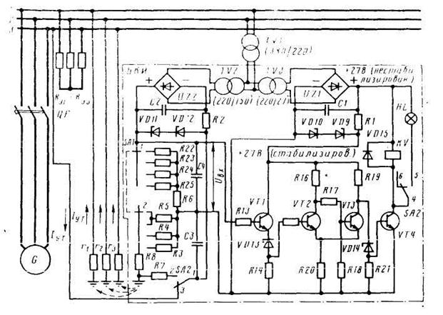 енной на транзисторах VТ1-VТ4 и реле напряжения КV. При этом на участке схемы с тран