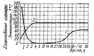 Рис. 6.14. Кривые изменения сопротивления изоляции (1) и температуры (2)
