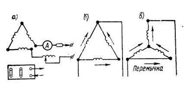 При этом ток пропускается, как указано на рис. 6.17, б (при соединении обмоток треугольником) и 6.17, в (при соединении обмоток звездой).