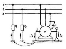 , обозначено сопротивление изоляции проводов 1 и 2 относительно корпуса.