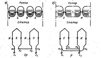 Эти обмотки имеют разное число пар полюсов и при работе двигателя включаются пооче-