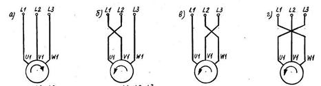 На рис. 9.22, б переброшены линейные провода L1 и L2 , на рис. 9.22, в – провода L2 и L3, на рис. 9.22, г - провода L1 и L3. В каждом из этих случаев на обмотке статора меняет