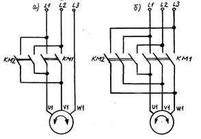 В схеме на рис. 9.23, а использованы 2-полюсные реверсивные контакторы КМ1 и КМ2, на рис. 9.23, б – треполюсные. В обеих схемах для реверса переключаются линей