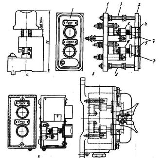 Рис. 9.24. Конструктивные формы кнопочных постов: а - кнопочный элемент; б – открыто утопленный пост; в – защищенный кнопочный пост; 4 – водозащищенный