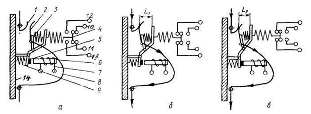 5 – поворотный якорь; 6 – сердечник электромагнита; 7 – катушка электромагнита; 8 – гибкая перемычка; 9 – отключающая пружина; 10-11, 12-13 - неподвижные контакты; 14 – изоляционная плита (основание)