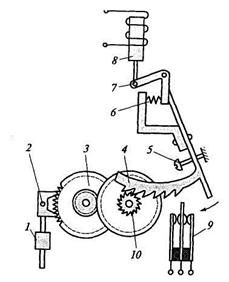 Рейка 4 своими зубьями зацеплена с храповым колесом 10, кторое через систему зубчатых колес 3 удерживается от быстрого перемещения анкерным механизмом 2.
