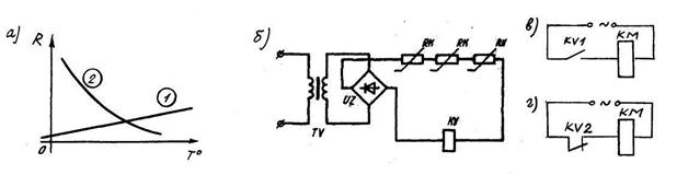 (1 – для позистров, 2 – для термисторов); б – принципиальная схема температур-