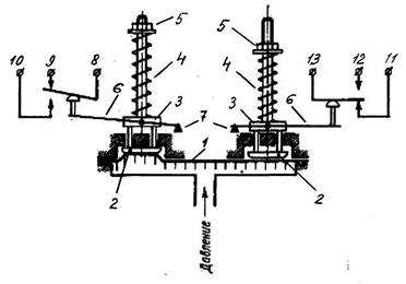 На рис. 9.54 изображено сдвоенное реле давления, состоящее из двух одинаковых частей – реле минимального давления (слева) и реле максимального давления (справа). Давление рабочего тела (воды, воздуха, масла) через резиновую мембрану 1 пере