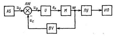 В качестве примера на рис. 1 приведена структурная схема автоматизированного электропривода постоянного тока, где AS – задающее устройство; AW – суммирующий элемент; U – управляемый преобразователь; М – электродвигатель; ПУ – передаточное устройство; ИО – исполнительный орган рабочей машины и BV – датчик обратной связи по скорости.
