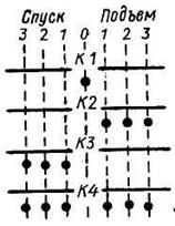 1-м, 2-м и 3-м положениях в направлении «Подъем» и разомкнут во всех остальных.