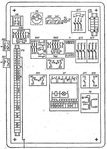 На схемах подключений панели, шкафы управления и др., вычерчивают в виде пустых прямоугольников или внешних очертаний, а их входные элементы, например, кабели и т.п., показывают условными графическими изображениями.