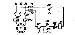 При перегрузке двигателя размыкается контакт теплового реле КК1 (КК2). При этом обрывается цепь катушки линейного контактора КМ, вследствие чего размыкаются главные контакты в силовой части схемы и вспомогательный, включенный параллельно кнопке SB1 «Пуск».