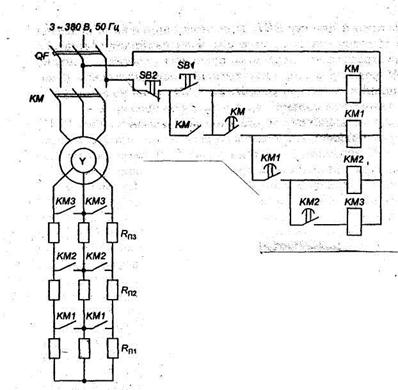 Рис. 122. Схема автоматического пуска асинхронного электродвигателя в функции времени через пусковые резисторы