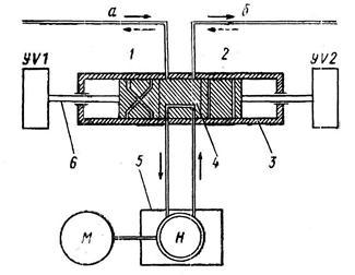 При выключенных электромагнитах посредством пружин поршень устанавлиается в среднем положении, что показано на рис. 10.20. В этом случае масляные каналы гидрозолотника связывают всасывающую и нагнетающую магистрали насоса Н, постоянно вращаемого электродвигателем М. Магистрали а, б силовых цилиндров рулевой машины перекрыты. Масло забирается насосом из бака 5 и сливается снова в бак. Вместимость бака должна быть достаточной, чтобы обеспечить отвод тепла, выделяемого в данном режиме холостой прокачки масла.