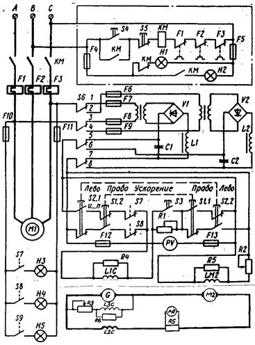 Схема предназначена для управления рулевым электроприводом при помощи кно-очного поста с кнопками «Лево», «Право» и «Ускорение». Такой вид управления называ-