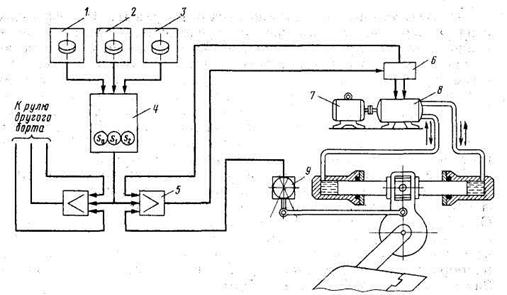 6 – прибор управления насосом переменной подачи, в состав которого входит датчик подачи насоса (т.е. скорости перекладки руля);