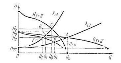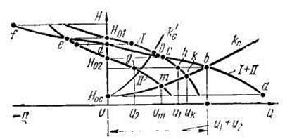 Точки h и g, лежащие на соответствующих характеристиках насосов I и II, пред-