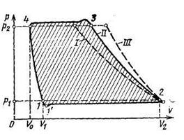 При обратном движении поршня с точки 2 начинается сжатие воздуха по кривой II, так как только часть выделившейся теплоты при сжатии воздуха отводится в систему охлаждения компрессора (политропический процесс).