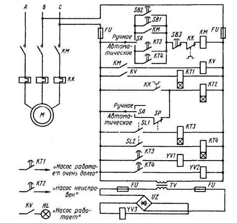 10. KV – промежуточное реле для сигнализации о том, что насос работает и для включения реле времени КТ1;