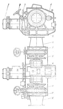 1 - электродвигатель; 2 - привод тормоза звездочки; 3 - привод кулачковой муфты; 4 - редуктор; 5 – фундаментная рама; 6 - турачки; 7 – подшипниковые щиты грузового вала; 8 – цепные звездочки