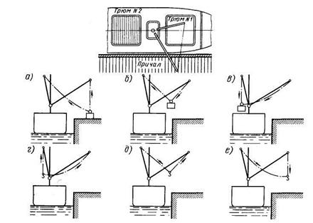 Если в грузовых операциях участвует одна лебедка, то грузоподъемный механизм обеспечивает подъем и спуск груза, а перемещают его за борт или к трюму вручную. Для приема груза с причала стрела выносится оттяжками к борту, после чего стропят груз. В последующем выбирают лебедкой шкентель и переводят стрелу с висящим на ней грузом к люку судна. После этого травят лебедкой шкентель и груз опускается в трюм.