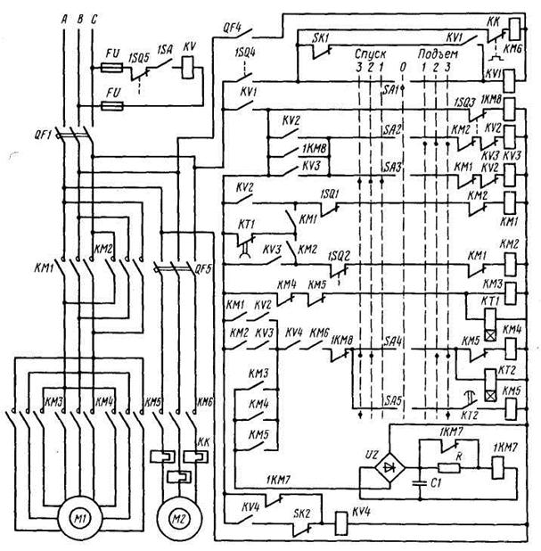 Принципиальная схема управления электроприводом механизма подъёма крана приведена на рис. 13.13. На рис. 13.14 показана общая для трёх механизмов схема включе
