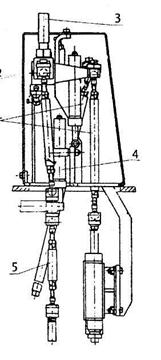 3 – рукоятка поста управления в крышке поста; 4 – пружинные нуль-установители; 5 – тяги распределителя