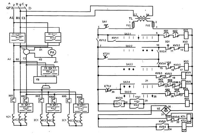 Схема управления состоит из силовой части (левая половина схемы) и собственно схемы управления (правая половина) (рис. 13.36)..