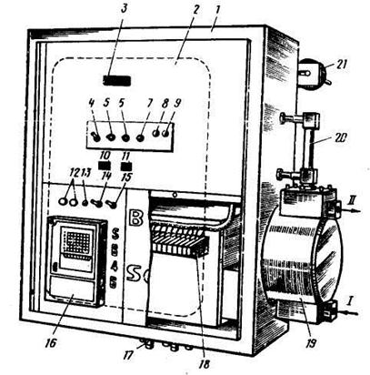 гулировки усилителя; 12 - предохранители; 13 - лампочка наличия питания; 14 - тумблер выключения питания; 15 - тумблер «Калибровка»; 16 - самописец; 17 - сальники; 18 - клеммные зажимы; 19 - измерительная камера, 20 - цилиндр с поршнем; 21 – амортиза-