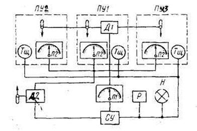 равления ПУ1 - ПУЗ. Поворот датчика Д2 вызывает перемещение стрелок приемников П2 и установку их в положение, соответствующее поданной команде (стрелки совмещаются с рукоятками постов управления ПУ1 - ПУЗ).