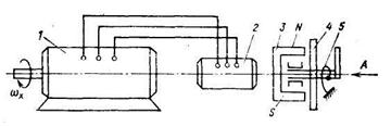 Трехфазные индукционные тахометры (рис. 16.16) имеют синхронный трехфазный генератор 1, механически соединенный с исследуемым валом, и синхронный двигатель 2, связанный с генератором 3-проводной линией.