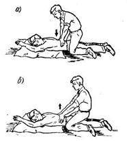 ков сложенными пальцами. Считая «раз», «два», «три», наклонять постепенно свое тело вперед, так чтобы навалиться на свои вытянутые руки и таким образом нажать на нижние ребра пострадавшего (выдох).