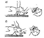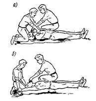 Рис. 18.2. Искусственное дыхание по способу Сильвестра: а – выдох; б – вдох