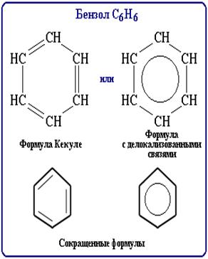 В 1865г. Кекуле предложил структурную формулу бензола, представляющая собой цикл из шести углеродных атомов с чередующимися одинарными и двойными связями.