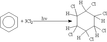 Радикальное галогенирование. Взаимодействие паров бензола с хлором протекает по радикальному механизму только под воздействием жесткого ультрафиолетового излучения. При этом бензол присоединяет три молекулы хлора и образует твердый продукт — гексахлорциклогексан (гексахлоран) С6Н6Сl6:
