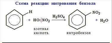 2. Нитрование. Бензол очень медленно реагирует с концентрированной азотной кислотой даже при сильном нагревании. Однако при действии так называемой нитрующей смеси (смесь концентрированных азотной и серной кислот) реакция нитрования проходит достаточно легко: