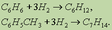 3. Гидрирование. Реакция присоединения водорода к аренам идет при нагревании и высоком давлении в присутствии металлических катализаторов (Ni, Pt, Pd). Бензол превращается в циклогексан, а гомологи бензола — в производные циклогексана: