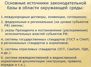 Правовое регулирование эколого-экспертной деятельности как одного из видов экологического менеджмента ‑ управления охраной окружающей среды и рациональным природопользованием является одной из основ знаний студента, опирающихся на соответствующие законы и подзаконные акты органов власти и управления Российской Федерации. При этом нормативно-методическое регулирование, в свою очередь, опирается на соответствующие нормативные (стандарты, нормы, правила и т.д.) и методические (пособия, инструкции, рекомендации, методики и др.) документы и материалы, разрабатываемые специализированными ведомствами и научными учреждениями.
