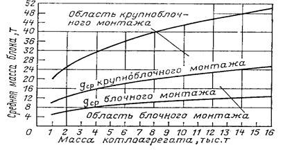 Дальнейшее развитие блочного монтажа турбинного и вспомогательного оборудования, станционных трубопроводов, а также выполнение обмуровочных и изоляционных работ на собранных блоках расширили применение блочной сборки. Коэффициент блочности прочно внедрился в монтажную практику как показатель совершенства конструкции оборудования и технологичности его для монтажных условий и как показатель совершенства технологии производства монтажных работ. Характеристика блочного и крупноблочного монтажа приведена на рис. 2.1.