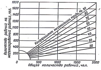 Процессы монтажа оборудования сборки, установки и пригонки узлов и деталей между собой в условиях монтажной площадки не поддаются полной механизации, и поэтому количество работающих вручную является достаточно большим (по отношению к общему числу рабочих); в связи с этим коэффициент механизации труда всегда будет меньше единицы.