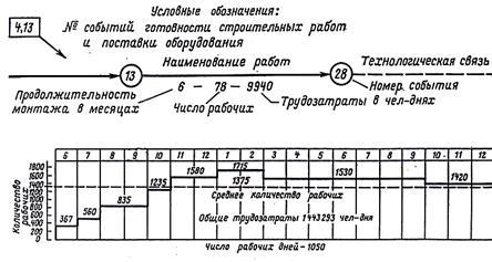 Связь между работами в сетевом графике характеризуется тем, что следующая работа не может быть начата до того, как закончена предшествующая работа (например, монтаж роторов турбины не может быть начат до установки нижней части цилиндров; гидравлика котла не может быть проведена до заварки всех стыков труб поверхностей нагрева).