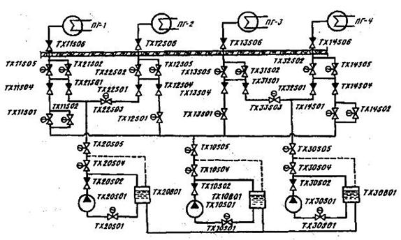 При нормальном режиме работы ЭБ система эксплуатируется в режиме "ожидание". Каждый из трех аварийных питательных насосов системы подключен к своему баку запаса обессоленной воды.