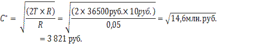 Например, предприятие имеет 100 руб. отток денег в день, семь дней в неделю. Процентная ставка составляет 5%, а фиксированные издержки пополнения денежного сальдо равны 10 руб. за сделку. Каков должен быть оптимальный начальный денежный баланс? Каковы общие издержки?