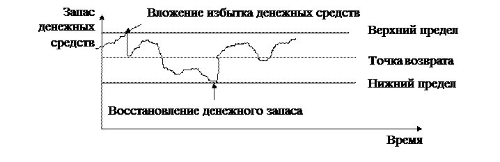 Логика действий финансового менеджера заключается в следующем. Остаток средств на счёте хаотически меняется до тех пор, пока не достигает верхнего предела. Как только это происходит, предприятие начинает покупать достаточное количество ценных бумаг с целью вернуть запас денежных средств к некоторому нормальному уровню (точке возврата). Если запас денежных средств достигает нижнего предела, то в этом случае предприятие продаёт свои ценные бумаги и таким образом пополняет запас денежных средств до нормального предела (рис. 8.2).
