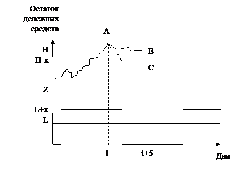 Н-х, например, его размер определяется в точке В, то (В–Z) у. е. будут обращены в ценные бумаги. Если же прогноз покажет, что в момент t+5 величина денежного остатка будет соответствовать точке С, то фирма не будет покупать ценные бумаги. Аналогичные рассуждения верны и в отношении нижнего предела.
